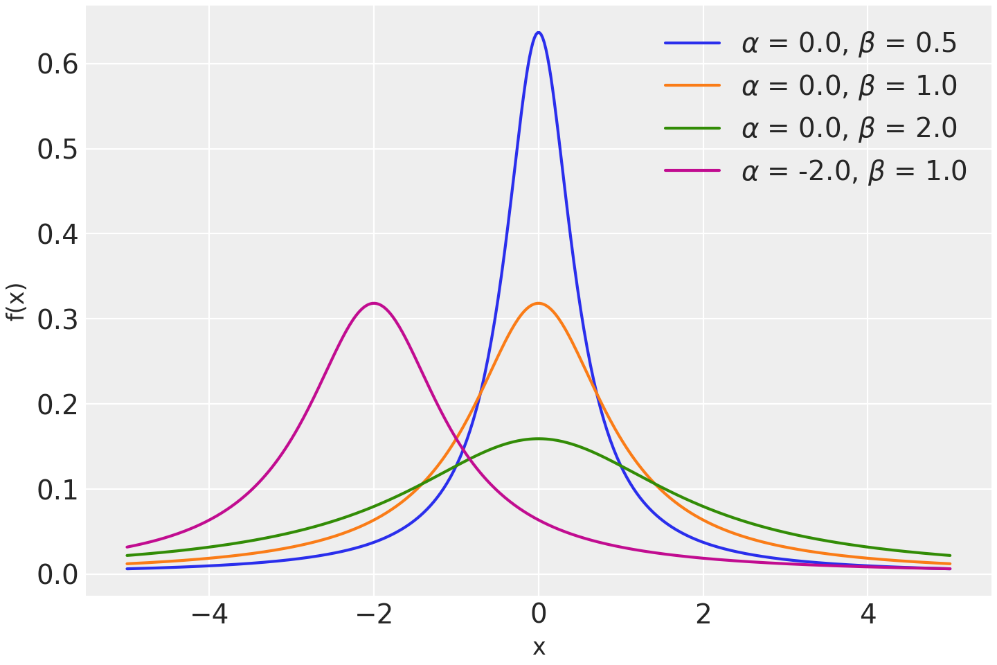 \[f(x \mid \alpha, \beta) = \frac{1}{\pi \beta [1 + (\frac{x-\alpha}{\beta})^2]}\]