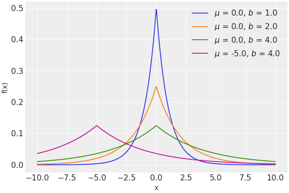 \[f(x \mid \mu, b) = \frac{1}{2b} \exp \left\{ - \frac{|x - \mu|}{b} \right\}\](