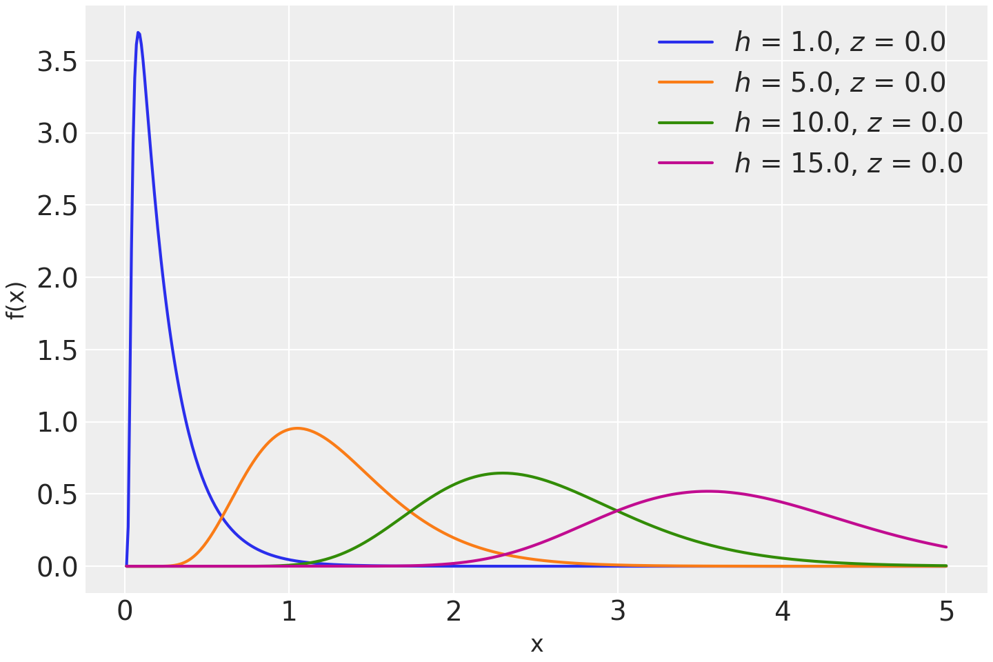 h(shape parameter) andz(exponential tilting parameter). The pdf of this distribution is\[f(x \mid h, z) = cosh^h(\frac{z}{2})e^{-\frac{1}{2}xz^2}f(x \mid h, 0),\]where \(f(x \mid h, 0)\) is the pdf of a \(PG(h, 0)\) variable. Notice that the pdf of this distribution is expressed as an alternating-sign sum of inverse-Gaussian densities.